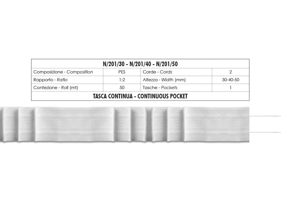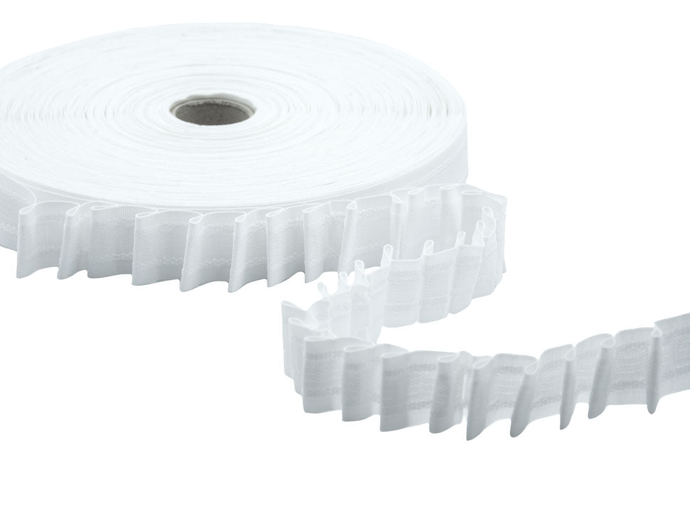 Les rubans fronceurs sont l’accessoire idéal et fondamental pour donner une touche particulière à chaque type de rideau, c’est pourquoi il est essentiel de choisir le bon ruban. De nombreux modèles sont disponibles sur le marché, tous avec la même fonction et la même méthode d’application, mais chacun est adapté pour réaliser un type de frisage différent. Le ruban le plus répandu présente des poches pour crochets et cordes pour se friser de manière automatique et régulière, de plus il est possible d’insérer les crochets dans les poches dans de multiples positions. C’est un ruban en polyester, il se présente comme un ruban avec des poches où insérer les crochets et a deux fils à tirer pour le frisage. Facile à coudre, parfait pour créer des rideaux design dans chaque pièce de la maison, vous pouvez l’utiliser sur tous les types de tissu léger, moyen et lourd. Pour obtenir sur la tente le frisage il suffit d’étendre et coudre le ruban sur le bord supérieur de la tente, le rapport de l’étendu à frisé est 2:1, deux mètres de tente étendue couvrent un mètre de fenêtre après le frisage. Cette mesure est indicative dans la mesure où plus les fils sont tirés, plus grand sera le frisage obtenu. Le ruban est emballé en rouleaux de 50 mètres, facile à utiliser car bien résistant et rigide, il peut être lavé à la machine à laver à 40 degrés centigrades (40 degrés C) et repasser sans aucun problème. Il reste inchangé dans le temps. Il est disponible en version blanche ou transparente (pour les tentes plus légères comme l’organza) et deux, trois ou quatre cordes (pour les tentes plus lourdes) en hauteur de 30mm à 170mm. Il s’agit de la version blanche de 30mm de haut en paquet de 50m.