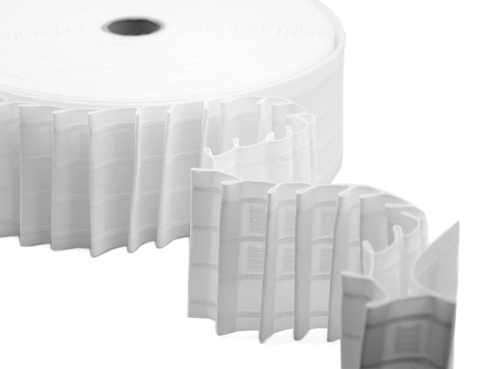 Les rubans fronceurs sont l'accessoire idéal et indispensable pour donner une touche spéciale à tout type de rideau, il est donc essentiel de choisir le bon ruban. Il existe de nombreux modèles sur le marché, tous avec la même fonction et la même méthode d'application mais chacun adapté à la création d'un type de curling différent. Le ruban le plus courante a des poches pour que les crochets et les cordes s'enroulent automatiquement et régulièrement, de plus il est possible d'insérer les crochets dans les poches dans plusieurs positions. C'est un ruban en polyester, il ressemble à un ruban avec des poches où vous pouvez insérer les crochets et a deux fils à tirer pour le curling. Facile à coudre, parfait pour créer des rideaux design dans n'importe quelle pièce de la maison, il peut être utilisé sur tous types de tissus légers, moyens et épais. Pour obtenir le curling sur le rideau, il suffit d'étaler et de coudre le ruban sur le bord supérieur du rideau, le rapport de propagation à bouclé est de 2:1, soit deux mètres de rideau tendu couvrant un mètre de fenêtre après le curling. Cette mesure est indicative car plus les fils sont tirés, plus le curling obtenu est importante. Le ruban est conditionné en rouleaux de 50 mètres, facile à utiliser car bien résiné et rigide, il peut être lavé en machine à 40 degrés centigrades (40 ° C) et repassé sans problème. Il reste inchangé au fil du temps. Il est disponible dans la version blanche ou transparente (pour les rideaux plus légers comme l'organza) et deux, trois ou quatre cordes (pour les rideaux plus lourds) dans des hauteurs de 30 mm à 170 mm. Ceci est la version blanche de 80 mm de hauteur.
