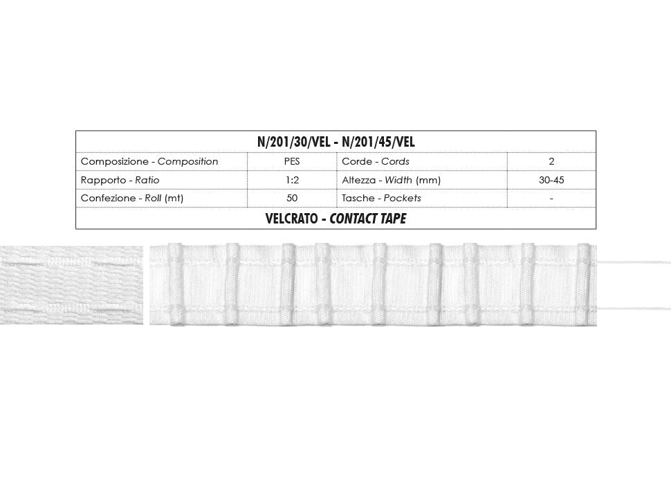 Les rubans fronceurs sont l’accessoire idéal et fondamental pour donner une touche particulière à chaque type de rideau, c’est pourquoi il est essentiel de choisir le bon ruban. De nombreux modèles sont disponibles sur le marché, tous avec la même fonction et la même méthode d’application, mais chacun est adapté pour réaliser un type de frisage différent. Le ruban le plus répandu présente des poches pour crochets et cordes pour se friser de manière automatique et régulière, de plus il est possible d’insérer les crochets dans les poches dans de multiples positions. C’est un ruban en polyester, il se présente comme un ruban avec des poches où insérer les crochets et a deux fils à tirer pour le frisage. Facile à coudre, parfait pour créer des rideaux design dans chaque pièce de la maison, vous pouvez l’utiliser sur tous les types de tissu léger, moyen et lourd. Pour obtenir sur la tente le frisage il suffit d’étendre et coudre le ruban sur le bord supérieur de la tente, le rapport de l’étendu à frisé est 2:1, deux mètres de tente étendue couvrent un mètre de fenêtre après le frisage. Cette mesure est indicative dans la mesure où plus les fils sont tirés, plus grand sera le frisage obtenu. Le ruban est emballé en rouleaux de 50 mètres, facile à utiliser car bien résistant et rigide, il peut être lavé à la machine à laver à 40 degrés centigrades et repasser sans aucun problème. Il reste inchangé dans le temps. Il est disponible en version blanche ou transparente (pour les tentes plus légères comme l’organza) et deux, trois ou quatre cordes (pour les tentes plus lourdes) en hauteur de 30mm à 170mm. Ceci est la version blanche haute 30mm.