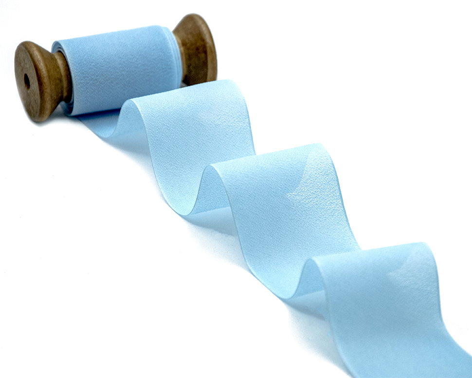 Ruban crêpe effet soie, 48 mm, bleu ciel. Ce ruban en mousseline de soie, délicat et léger, est aussi doux au toucher que la soie. Fabriqué en fil 100 % polyester de haute qualité, il présente une texture mate et semi-transparente. Associez-le à vos bouquets de fleurs, vos faire-part, pour créer un marque-place unique ou pour un emballage raffiné. Code couleur n° 593. Bobine de 25 mètres.