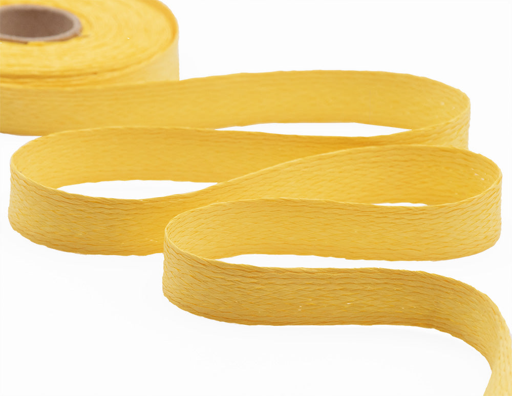 Ruban en papier tissé soufre de 25 mm. Ce ruban est idéal pour emballer des cadeaux et des compositions florales. 100 % écologique. Il peut être utilisé seul ou étiré pour créer un filet. La texture du papier lui confère un aspect particulièrement naturel. Nos rubans et cordons en papier sont écologiques car ils peuvent être entièrement enveloppés dans du papier. Code couleur n° 430. Conditionné en bobines de 10 mètres.
