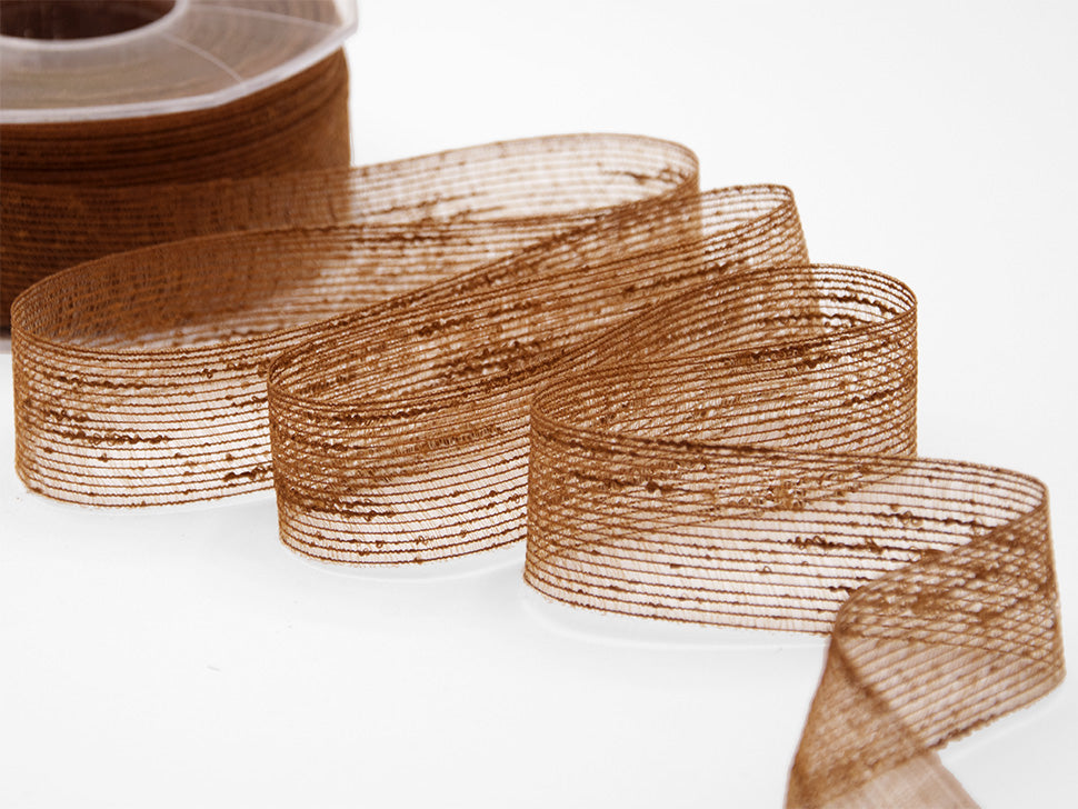 Voile 40 MM Marron. Le ruban veletta est un ruban rustique et transparent, tissé avec du fil bouclé qui, tout en couvrant et en se cachant, laisse entrevoir ce qu'il y a en dessous. L'article N27 est composé de fils irréguliers avec des boucles qui dépassent avec un effet de boutonnière. Le ruban de voile prend ainsi un aspect irrégulier, simple, rugueux et se caractérise par de petits nœuds de taille variable en surface. Ce ruban rustique convient aux créations DIY originales, à la fois dans un style décontracté et contemporain, comme la décoration et l'embellissement de la maison ou du jardin ou pour les créations de splendides faveurs maison adaptées à toutes les cérémonies et occasions. . Code couleur # 44 - EMBALLÉ EN BOBINE DE 25 MÈTRES