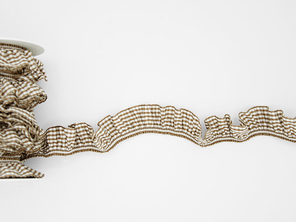 Bamby Avec Élastique 25 MM Cannelle. Il s'agit d'un ruban à carreaux, également appelé vichy, adapté aux décorations pour enfants, comme les nœuds de naissance pour bébés et filles, ou, dans d'autres couleurs, pour les emballages champêtres et rustiques. Dans cette version, il est présenté avec l'élastique sur un bord pour former un rouge très confortable à appliquer sur les bords. Code couleur # 55 - EMBALLÉ EN BOBINE DE 5 MÈTRES