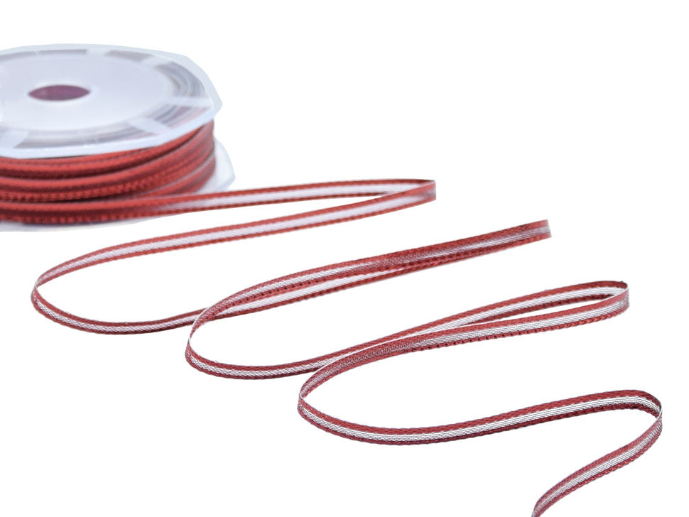 Voile Lame 3 MM Rouge. Le ruban voile lamé est un tissu à la texture fine et transparente, très brillant et scintillant. Élégamment conçu, le rouleau de ruban lamé peut être utilisé à diverses fins. Agréable à travailler, nous pouvons créer de beaux nœuds pour des emballages élégants et coûteux, créer des décorations de Noël pour la maison et le jardin, personnaliser des cadeaux de mariage. Le ruban lamé décoratif est fait de fil 100% polyester, avec un bord simplement plus épais contient une texture légère, brillante et douce, offre un aspect luxueux et une sensation éthérée. Code couleur # 31 - EMBALLÉ EN BOBINE DE 25 MÈTRES