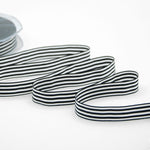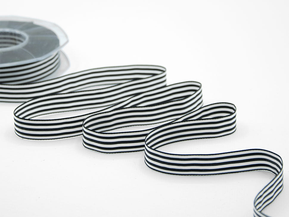 Bamby Rigato 15 MM Nero. Il Bamby rigato è un nastro a righine, adatto agli utilizzi per le decorazioni dei bambini, come i fiocchi di nascita bimbo e bimba, oppure, negli altri colori, per confezioni country e allegre, tipo brandina. Codice colore# 33 - CONFEZIONATO IN BOBINA DA METRI 25
