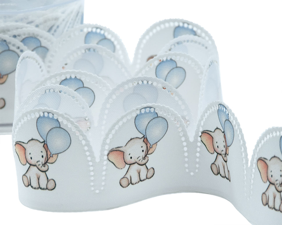 Margherita Portaconfetti 50 MM Stampa Balloon Elefante Azzurro. Il nastro portaconfetti permette di confezionare bomboniere o segnaposti in modo semplice e divertente. Venduto a rotolo da 10, abbiamo calcolato che con una bobina di nastro da 10 metri e l'utilizzo di 5 petali per bomboniera, ovvero 26 cm di nastro portaconfetti, si possono realizzare circa 37 coccarde bomboniere. Facilissimo da lavorare, per confezionare la nostra coccarda basta srotolare il nastro, inserire in ogni petalo un confetto, tagliare il nastro dopo 5 tasche, afferrare i tiranti da entrambi i lati (due per ogni lato) tirare, ottenendo così in un semplice gesto dei bellissimi fiori margherita, con 5 petali e cinque confetti.
