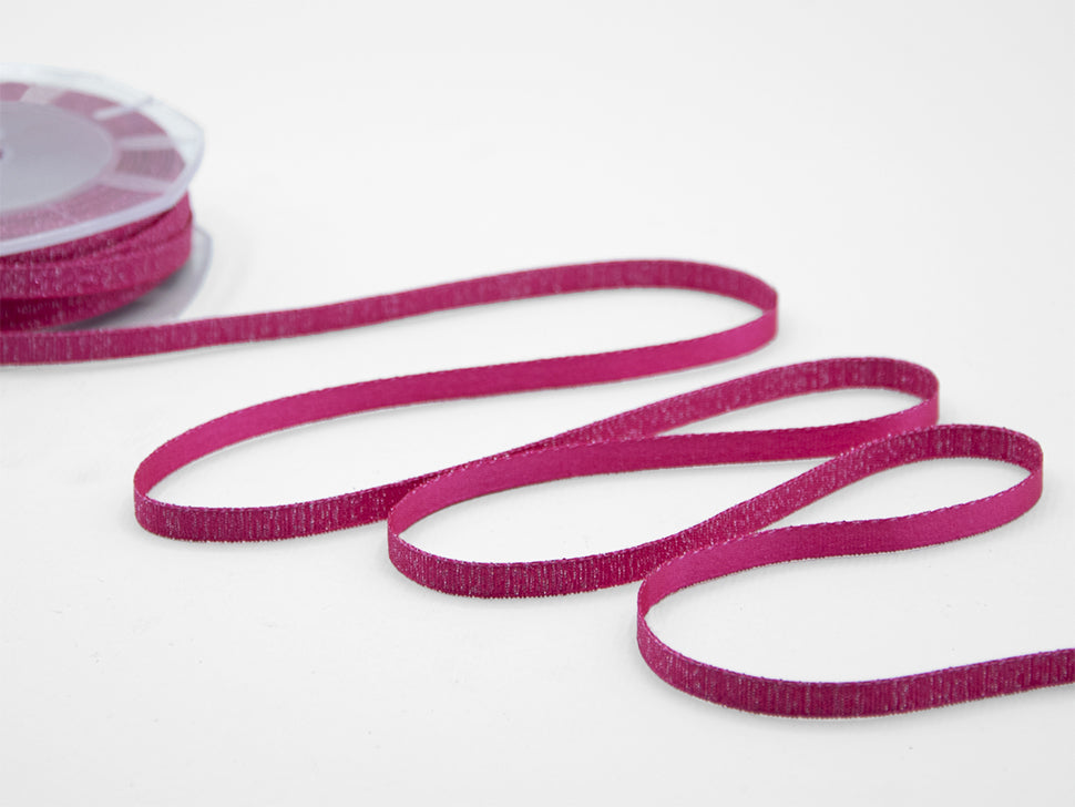 Raso Boutique Lame 6 MM Fuxia Peonia. Questa magnifica variante del nostro doppio raso è caratterizzata dalla tramatura con filato lamè che da un lato dona un aspetto glitter al nastro, dall'altro un aspetto più elegante e raffinato con la presenza del lamè delicata e tenue. Il Raso lamé è adatto a tutte le confezioni per il Natale, alle nozze, alle celebrazioni eleganti e glamour.. Codice colore# 26 - CONFEZIONATO IN BOBINA DA METRI 20